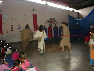 Vocês poderão ver a simplicidade do cenário, que básicamente é constituído por um grande pano azul onde " grudamos estrelas prateadas com fita crepe", e panos - muito e muitos panos que formam a gruta e o local onde estão os pastores.A peça conta a história do nascimento do Menino Jesus - e começa pela longa caminhada de Maria e José , o sonho dos pastores, e sua ida à Belém levando presentes singelos para ofertar ao Menino.